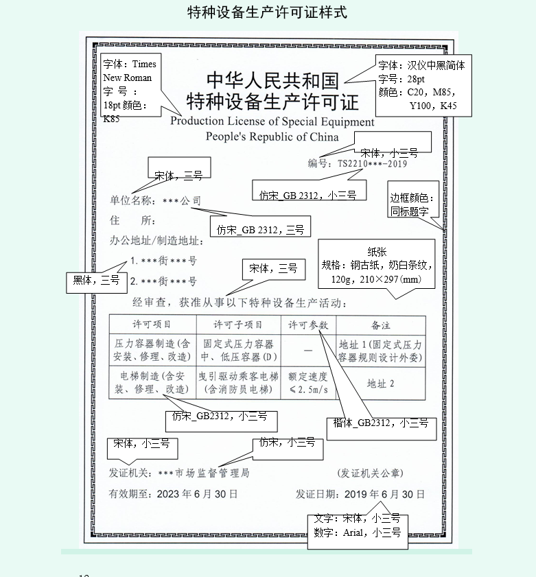 9.樣式中,標注顏色的為紙質(zhì)許可證上預(yù)先印制的;只標注字體和字號,未標注字顏色的為計算機打印(黑色)的。